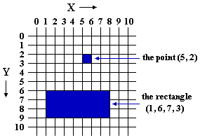 A Rect defines a rectangular area. The x and y co-ordinates define the top-left point within the rectangle, and the rectangle's width and height are recorded in pixels. The point (x+width,y+height) will thus be outside the rectangle.